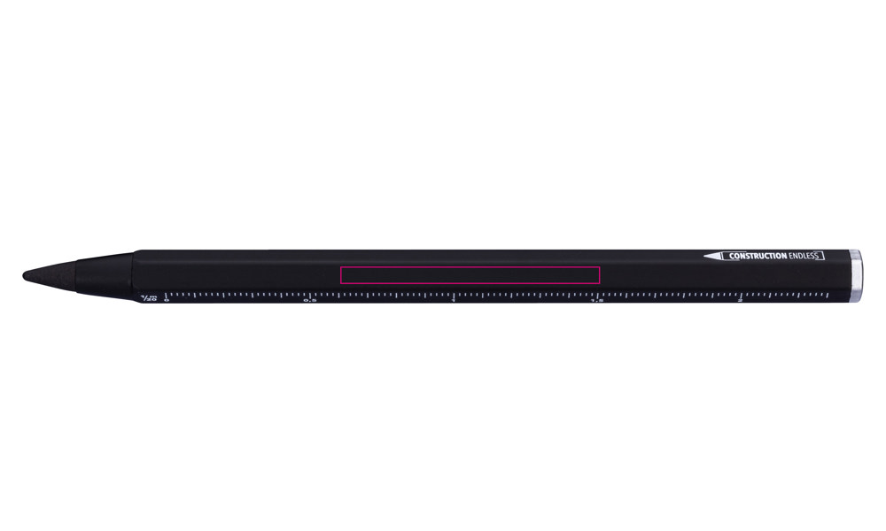 Multitasking-Bleistift mit nachhaltiger Endlos-Schreibspitze (ca. 20km Schreiblänge), HB, radierbar, ohne Anspitzen, Zentimeter-/Zoll-Lineal, 1:20/1:50 Skala, Schreibspitze austauschbar, Aluminium, Metall, glänzend, Carbon Optik