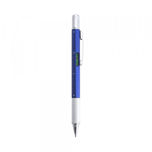 4-in-1 Multifunktions-Dreh-Kugelschreiber in verschiedenen Farben. Mit weichem Griff und integrierter Wasserwaage sowie Lineal mit Skala in Zentimetern und Zoll und Doppelkopf-Schraubendreher - schlitz- und kreuzförmig. Mit Metallclip und blauer Tinte.