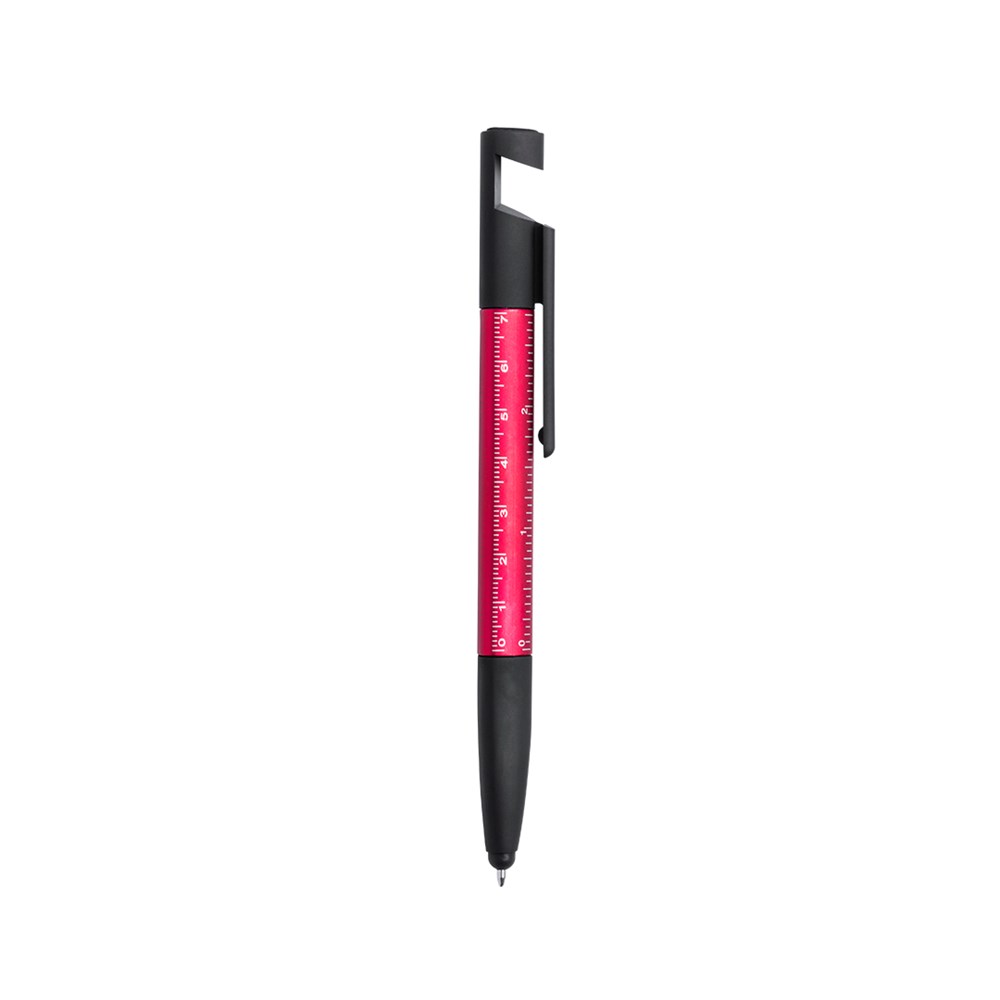 7-in-1 Dreh-Kugelschreiber in verschiedenen kräftigen Farben. Mit Ständer für Mobilgerät, Stylus, Displayreiniger, integriertem Lineal mit Skala in Zentimetern und Zoll, sowie Schlitz-und Kreuzschraubendreher. Blaue Tinte.