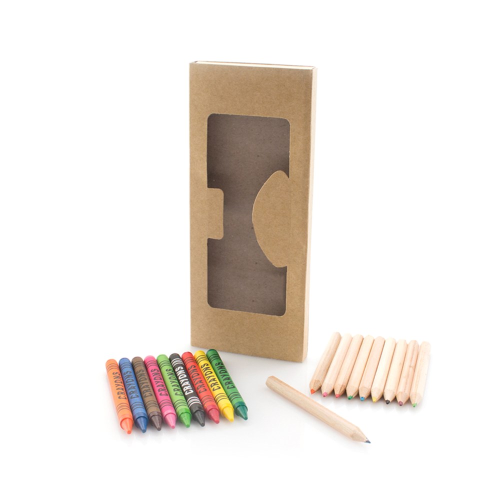 19-teiliges Set in einer Schachtel aus Naturkarton mit Fenster und herausnehmbarem Fach. Enthält Wachsmalstifte mit zylinderförmigem Schaft und Bunstifte aus Naturholz mit sechseckigem Schaft in verschiedenen Farben.