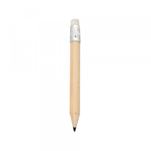 Mini-Holzbleistift mit Naturfinish. Mit rundem Schaft und weißem Radiergummi. Schwarze Mine und scharfe Spitze.