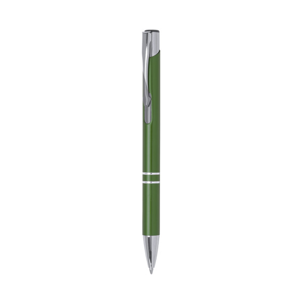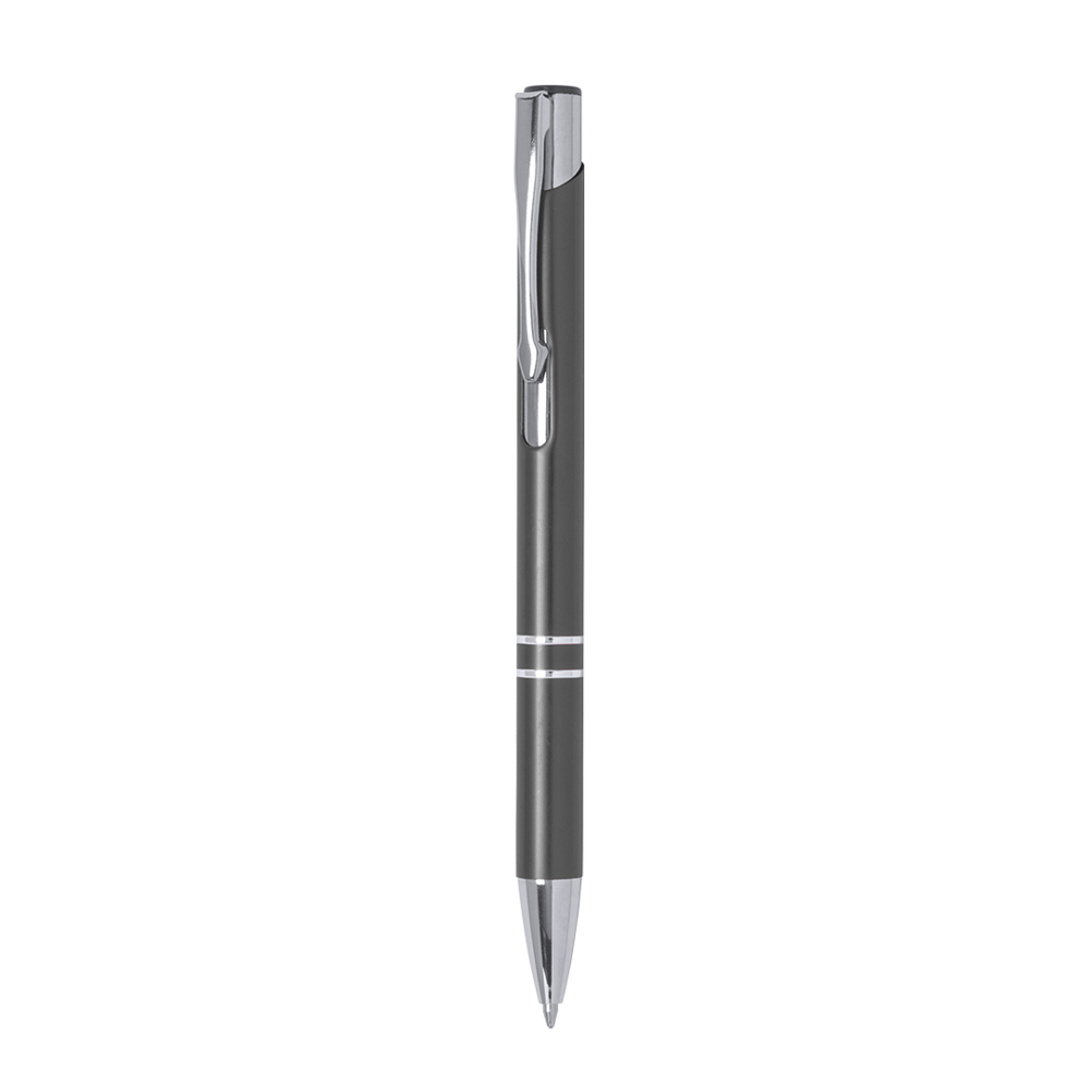 Origineller Kugelschreiber mit Druckknopfmechanismus in elegantem zweifarbigen Design. Gestanzter Aluminiumschaft mit glatter Oberfläche in verschiedenen Farben. Origineller Clip, Ringe und Spitze in Silber. Mit Jumbo-Mine und blauer Tinte.