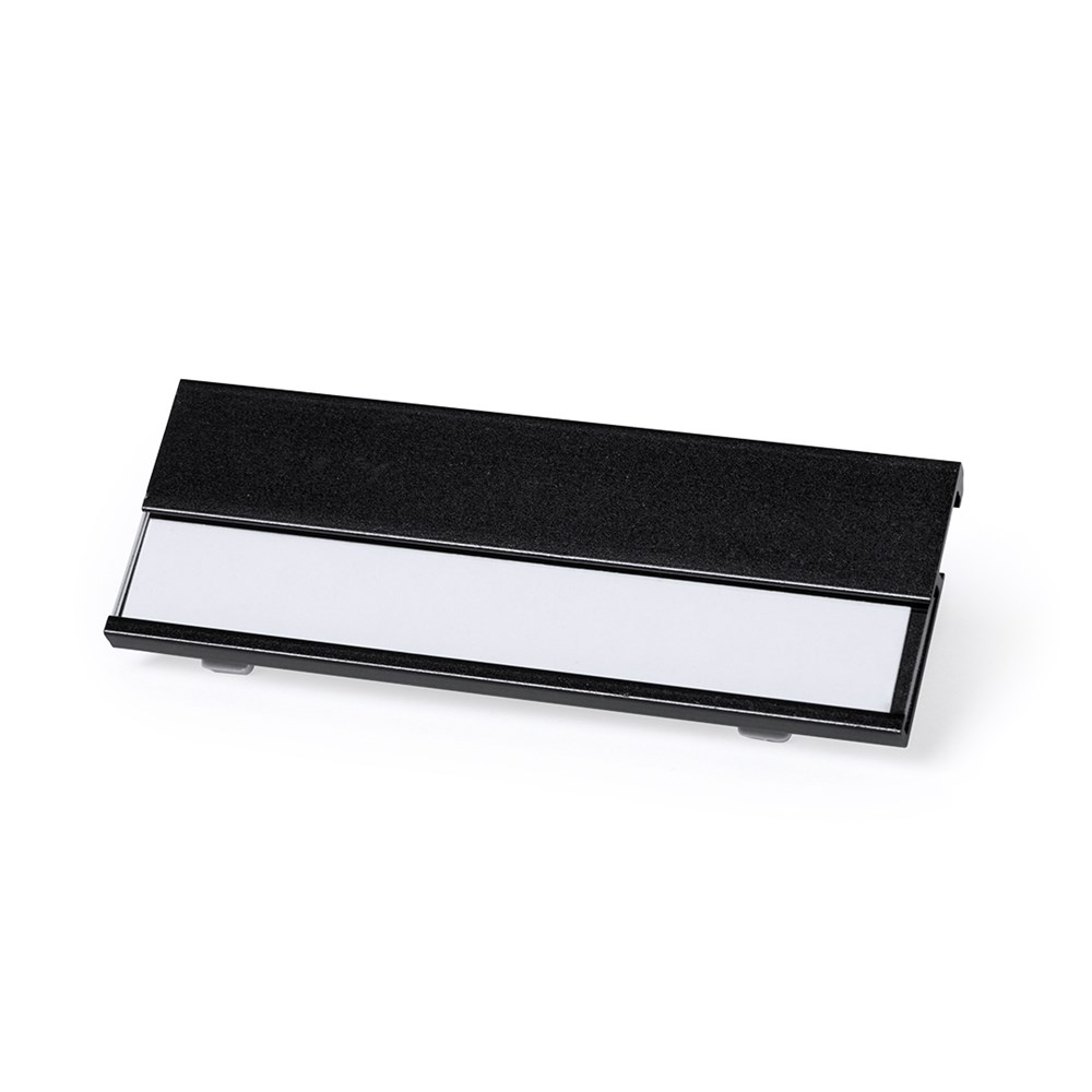 Aluminium-Namensschild in lebendigen Farben mit Befestigungsnadel auf der Rückseite.
