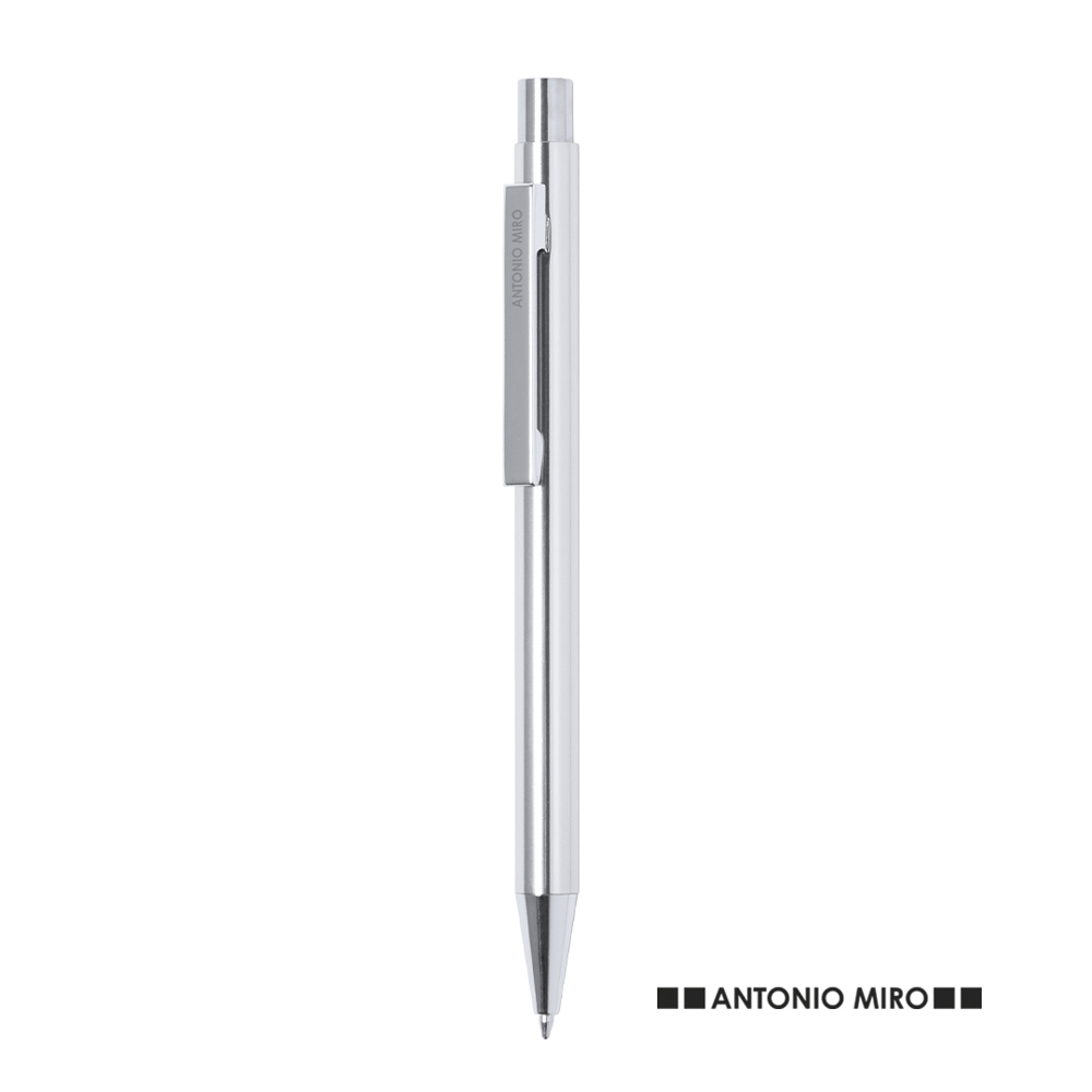 Druck-Kugelschreiber von Antonio Miró mit Aluminiumschaft in verschiedenen Farben und Silber. Präsentiert in einem Beutel mit dem Markenlogo. Blaue Tinte.