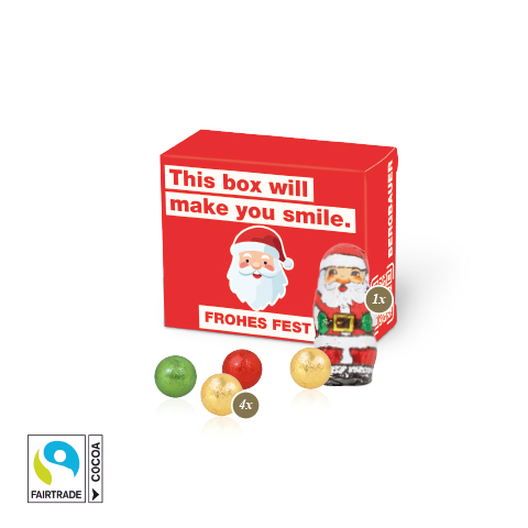 Kleine Aufmerksamkeit! Die neue Santa Box begeistert mit köstlicher Schokolade und mit Ihrem individuellen Firmendesign. Überraschen Sie Ihre Kunden in der Weihnachtszeit mit diesem kleinen, aber feinen Geschenk, das große Freude bereitet. Produktdetails: Individuelle Präsentverpackung aus hochwertiger Kartonage mit süßer Füllung. Nachhaltigkeit: Wir verwenden FSC®-zertifizierten Karton aus nachhaltiger Forstwirtschaft und anderen kontrollierten Quellen. Für jede Bestellung mit uns wird ein Baum über Grow my Tree gepflanzt.