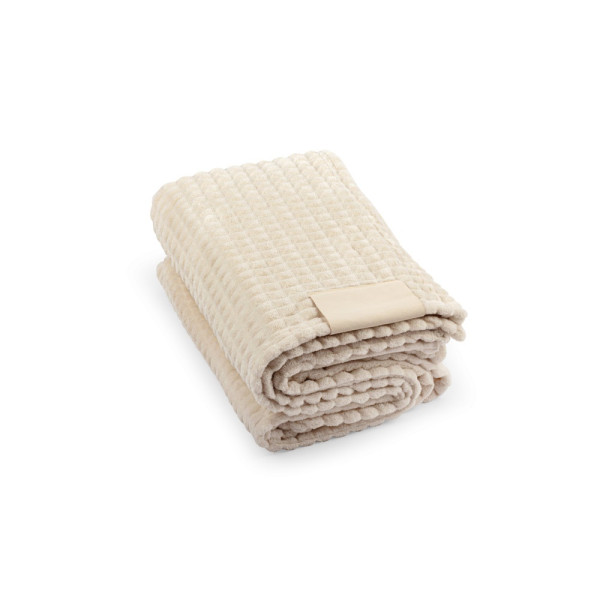 Decke aus recyceltem Polyester (100% rPET) mit einem Aufnäher zur individuellen Veredelung. Sie fühlt sich weich an und garantiert komfort bei jeder Gelegenheit. 1601 x 1200 mm