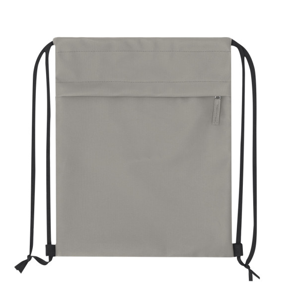 Kordelzug-Rucksack aus weichem PU kombiniert mit robustem 600D-Polyester. Mit funktionaler Fronttasche mit Reißverschluss und farblich passendem PU-Zipper.