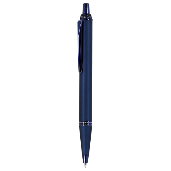 Kugelschreiber mit Aluminiumgehäuse, gummierter Oberfläche und Chromdetails. Druckmechanismus, Jumbo-Mine und blaue Tinte.