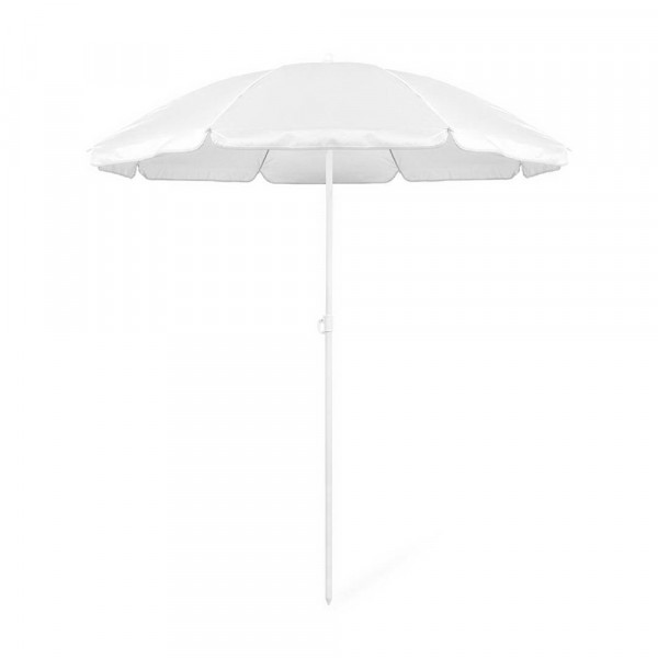 Sonnenschirm mit 8 Panelen aus robustem Nylon in verschiedenen lebendigen Farben. Mit einem Durchmesser von 150 cm, Paspelierung an den Rändern und höhenverstellbaren Metallrohren in Weiß. Präsentiert in einer PVC-Hülle mit Schultergurt.