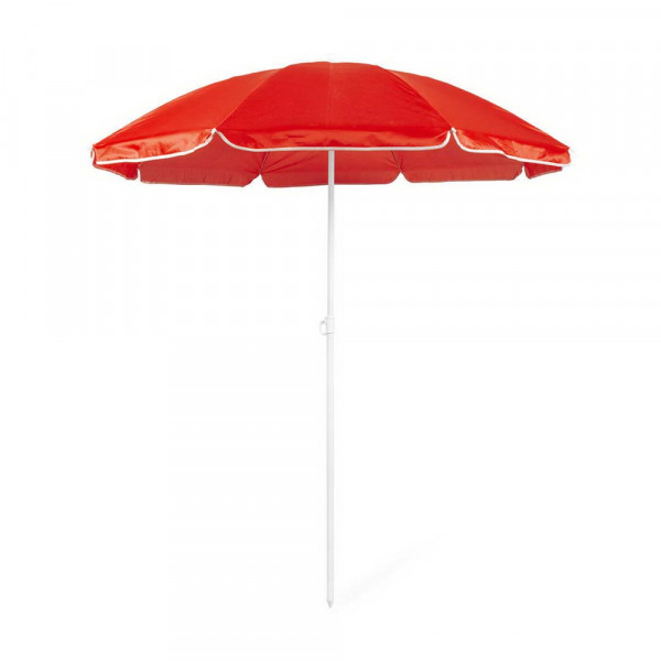Sonnenschirm mit 8 Panelen aus robustem Nylon in verschiedenen lebendigen Farben. Mit einem Durchmesser von 150 cm, Paspelierung an den Rändern und höhenverstellbaren Metallrohren in Weiß. Präsentiert in einer PVC-Hülle mit Schultergurt.
