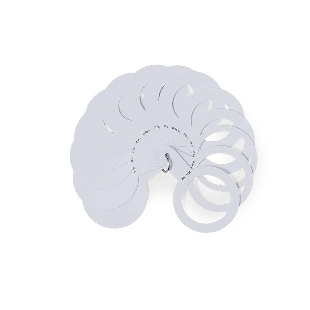 Manueller Messschieber aus widerstandsfähigem PP. Für Durchmesser von 30 mm bis 90 mm, ideal zum Messen und Sortieren in Echtzeit und nach Größe. Verfügt über 8 stufenweise ansteigende Schablonen alle 2 mm, eine davon mit einer flachen Oberfläche für das Branding. Verbunden durch einen praktischen Tragering.