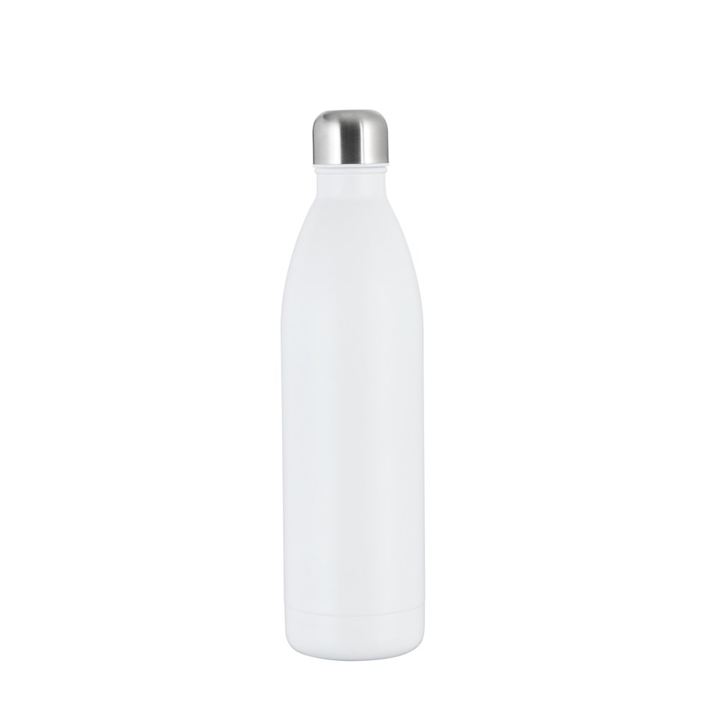 The double-walled thermo drinking bottle holds 750 ml and is the larger alternative to our original model. It keeps your drinks hot or cold and impresses with its particularly large, prominent logo area. It is available either with white or black powder coating or in stainless steel matt silver with anti-fingerprint coating. The screw lid protects against leakage.
