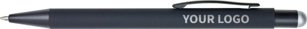 Aluminium and ABS ballpen with rubber coating and rubber tip for capacitive screens. When the pen is lasered, the imprint will show in colour. Blue ink.