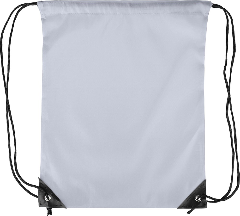 Polyester 210D drawstring backpack with two black PU corners on the front and internal sewing....