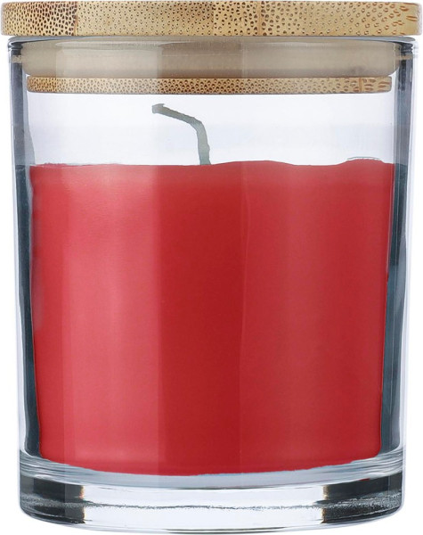 Glass candle with 120 grams of colored wax and a vanilla scent, housed in a transparent glass container with a bamboo lid. Provides approximately 20 hours of burning time. Individually packaged in a white carton tube.