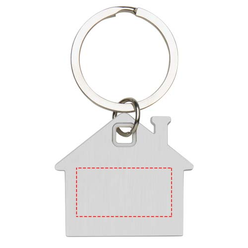 House-shaped keychain with a stainless steel plate with a frosted design front and back, and a...