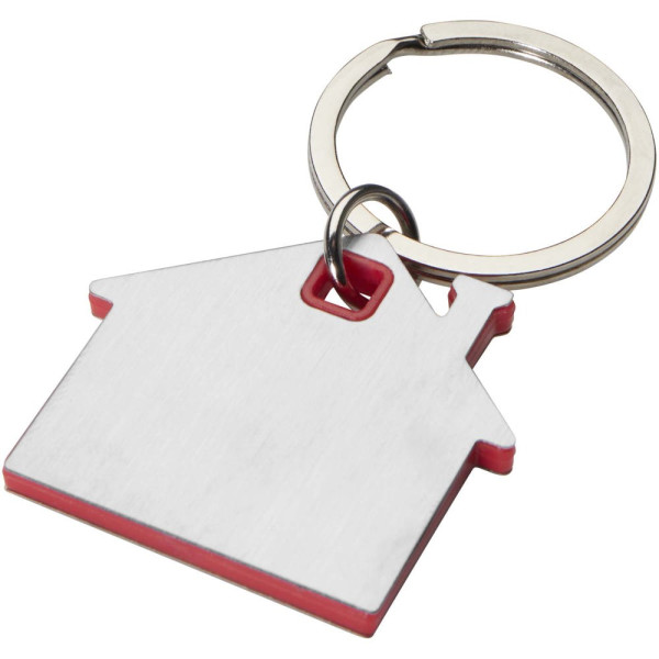 House-shaped keychain with a stainless steel plate with a frosted design front and back, and a coloured plastic chip in the middle.