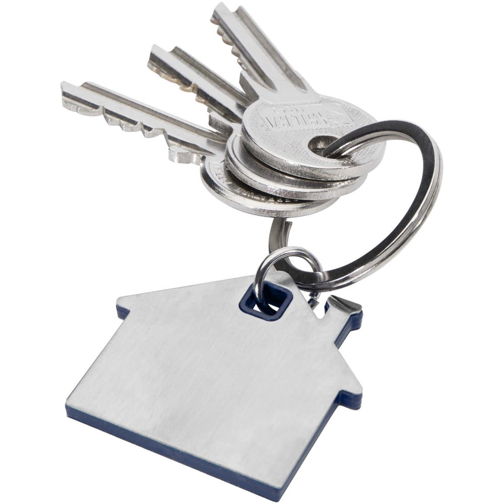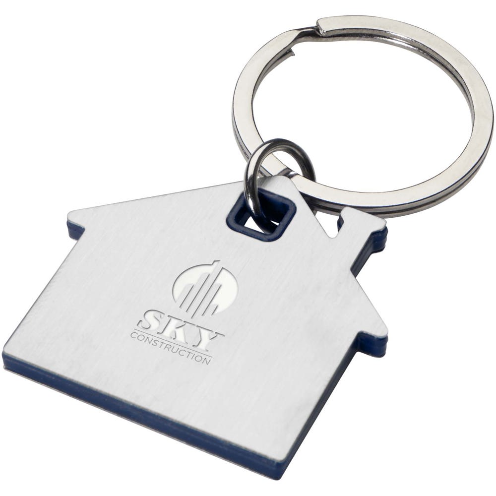 House-shaped keychain with a stainless steel plate with a frosted design front and back, and a coloured plastic chip in the middle.
