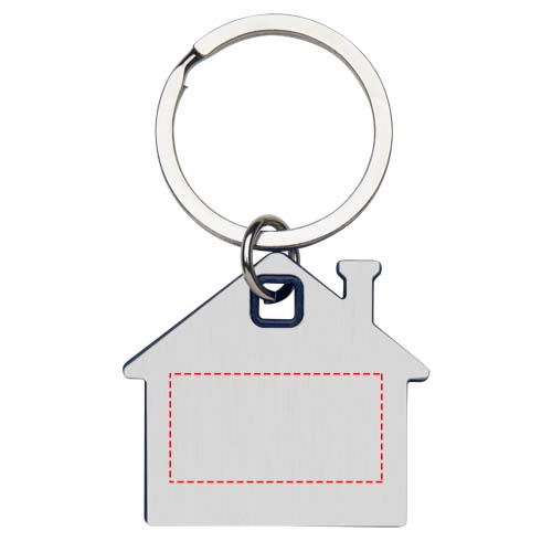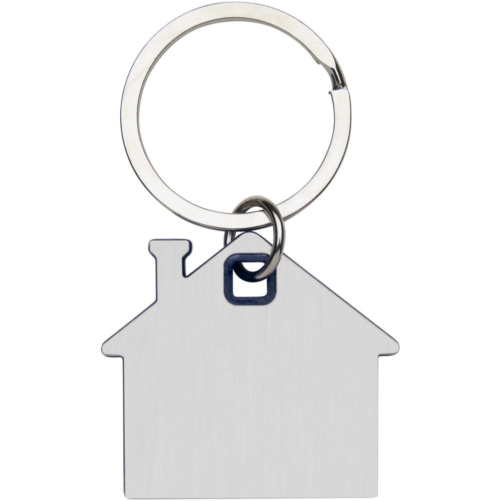 House-shaped keychain with a stainless steel plate with a frosted design front and back, and a...