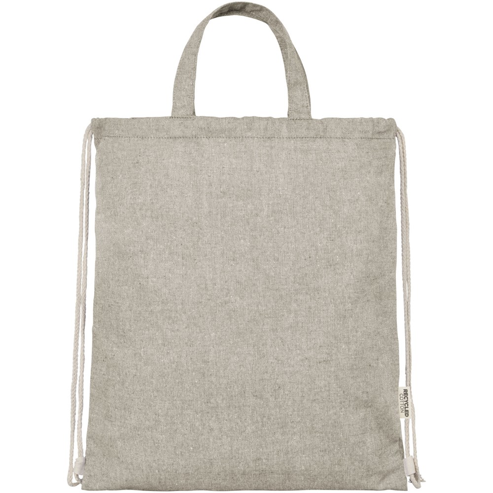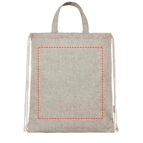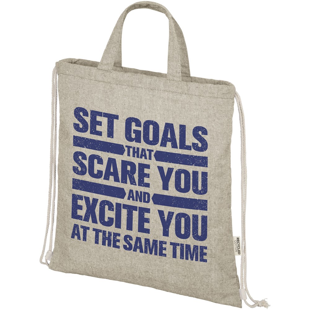 Drawstring bag made of a 150 g/m² recycled cotton polyester blend. Large main compartment with cotton drawstring closure in natural colour. Recycled cotton is manufactured from pre-consumer waste generated by textile factories during the cutting process. Similar colours are blended together so no additional dyeing is required. Due to the nature of recycled cotton, there may be a very slight colour variation. This distinctly adds to a more authentic appearance. Each backpack also comes with an Aware™ tracer. This innovative feature allows users to trace the origins and journey of their item through a QR code, enhancing transparency in the supply chain and fostering a stronger connection between the product and its production process. Resistance up to 5 kg weight. Handle length: 14 cm.