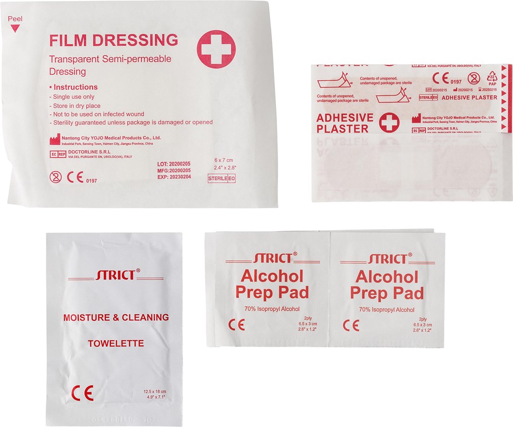 First aid kit in a polyester (210D) drawstring pouch. Including: five plasters, two alcohol pads, a damp cloth, a desinfectant cloth, and a bandage. This product may only be sold and delivered within the European Union.