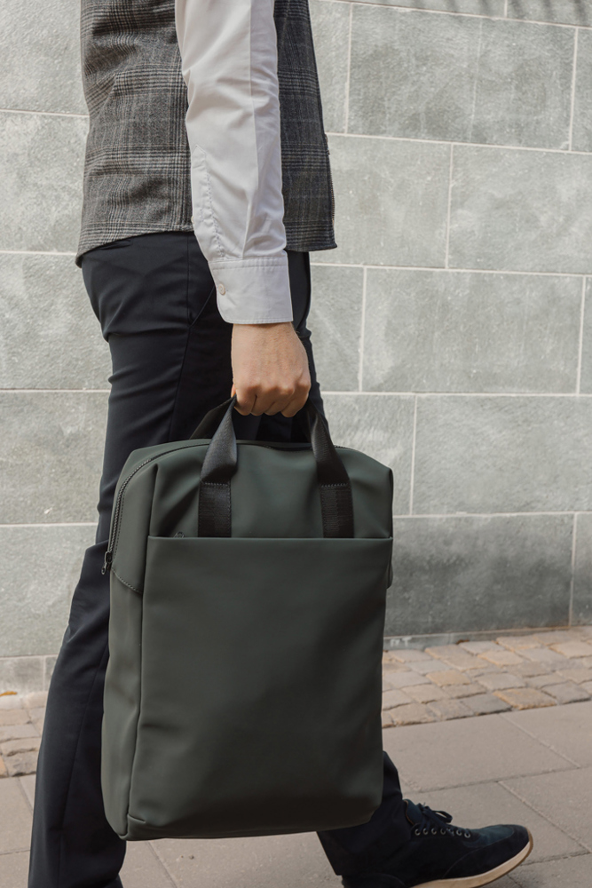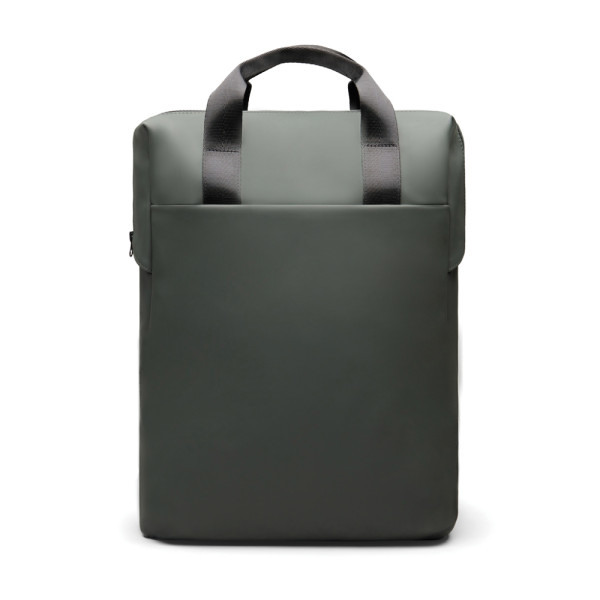 An easy-to-handle bag with a sleek design. Carry it as a tote bag or a backpack. The bag features a wide zippered opening for convenient packing of your laptop and other valuables. A strap on the back allows it to be attached to a trolley for smooth travel. It also includes a large front pocket, an inner pocket, and a practical bottle holder. Certified by RCS (Recycled Claim Standard), RCS certification guarantees that the entire supply chain of recycled materials is certified. The total recycled content is based on the overall product weight. This product contains 19% RCS certified recycled polyester.