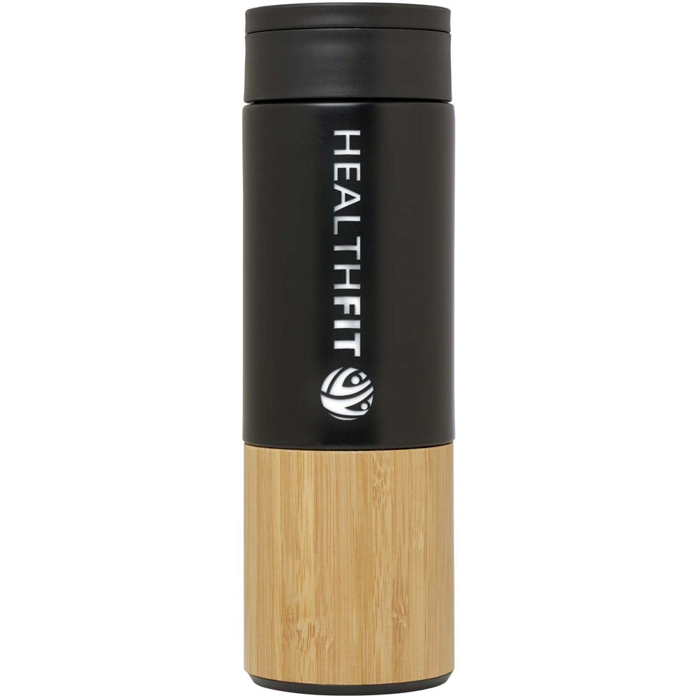 The Carmen gift set includes an A5 hard cover notebook, a ballpoint pen, a water bottle, and an umbrella. The notebook has a black elastic closure and a ribbon marker, and 80 lined cream-coloured sheets of 80 g/m² paper. The notebook cover together with the bamboo semicircle functions as a phone stand. The ballpoint pen is made of RCS certified recycled aluminium with a black spray coating and bamboo grip. Pen ink: Black. Writing length: 1000 metres. The 450 ml water bottle is made of stainless steel with a bamboo accessory at the bottom. Hand wash only. Bottle size: 6.6 x 22.2 cm. The 21" umbrella has a black pongee fabric canopy, black metal shaft, black fiberglass ribs, and a bamboo handle. Umbrella size: 28.3 x 5.5cm. Gift box size: 36 x 30 x 8 cm.