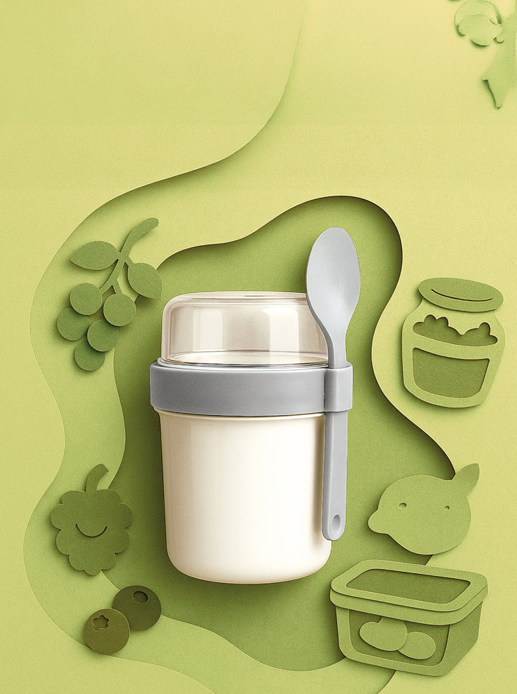 Cereals to go - your perfect companion for an energetic start! With spoon and additional container inside Material: PP, PC, silicone Capacity: 560 ml (cup), 230 ml (transparent lid), 35 ml (additional container) Dimensions: Ø 99 mm x 157 mm Weight without packaging: 144 g Plastic-free individual packaging