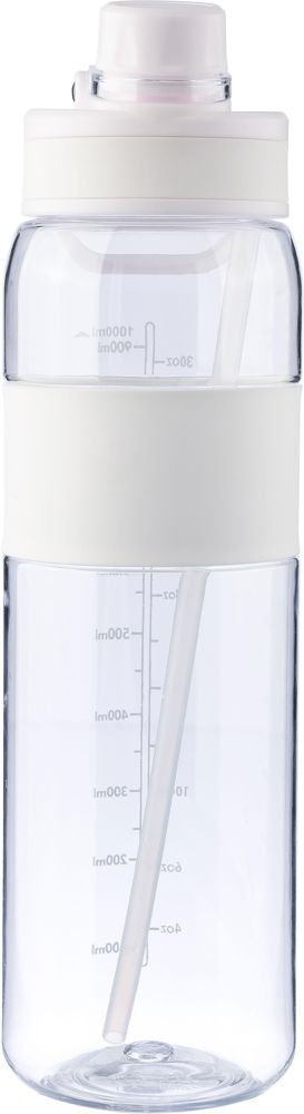 Tritan drinking bottle (900 ml) with two drinking options: a twist-close opening and a foldable straw with internal tube. Features a silicone grip, PP carrying handle, and printed capacity indicator. Screw lid. Packed in eggcrate.