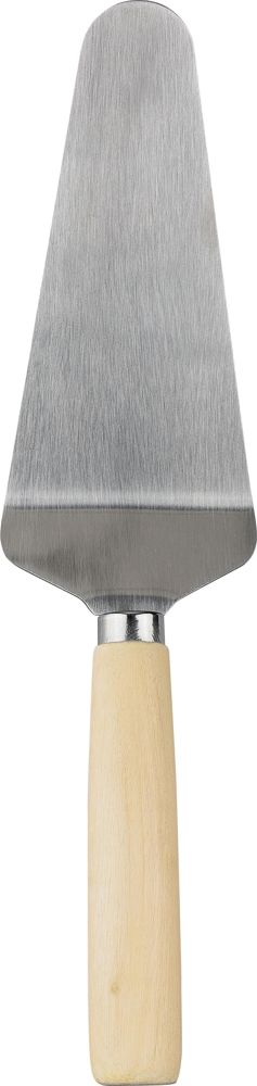 Bamboo pizza board with handle and pre-cut slice guides for easy serving. Includes a stainless steel and beechwood pizza cutter and spatula. Features a PU hanging cord on the handle. A practical 3-piece set consisting of a board, knife, and pizza slicer. Individually packaged in a brown cardboard box.