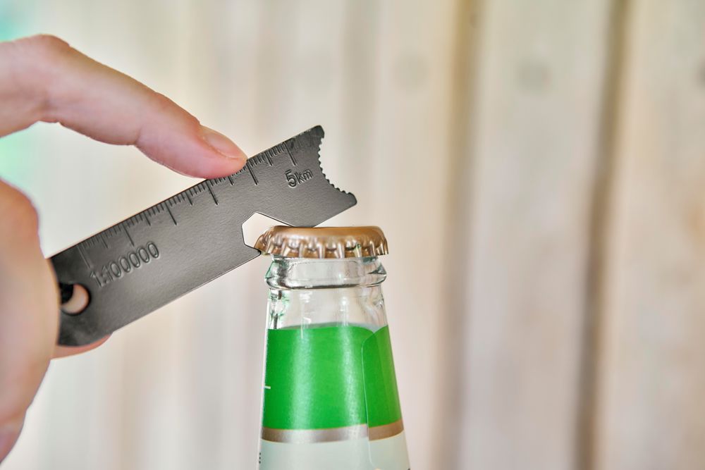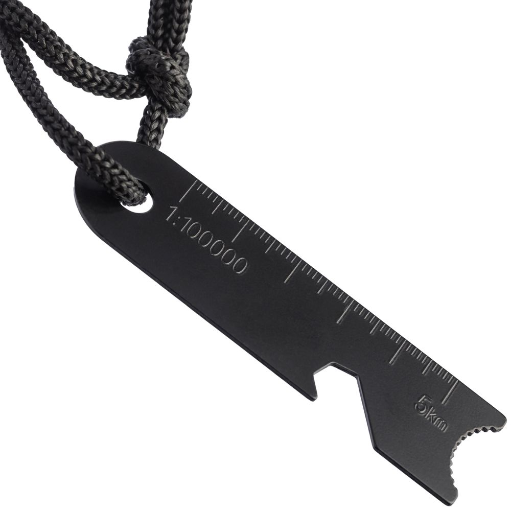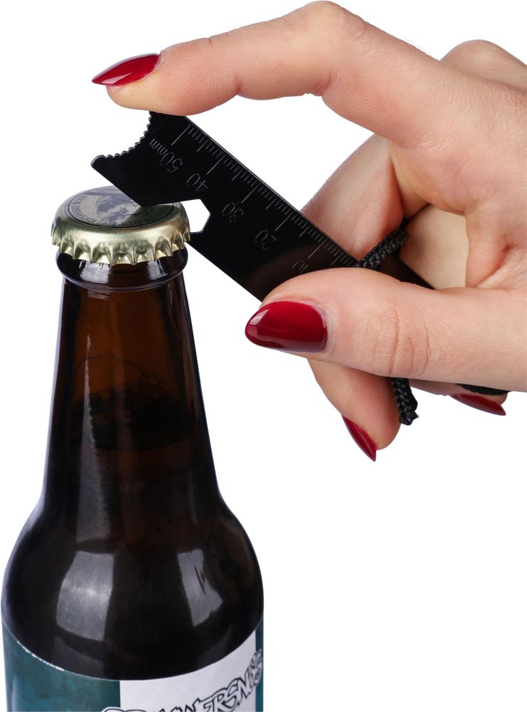 Stainless steel firestarter with pine wood handle and polyester cord connecting the scraper tool and lighting stick. The multifunctional scraper includes a bottle opener, precision ruler, and hex key. To activate, scratch off the black coating on the lighting stick before use. Two-part set. Individually packaged in a brown cardboard box.