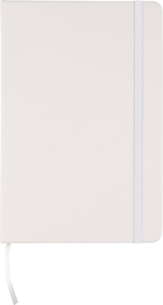 rPET notebook (approx. A5) with a hard cover made of rPET PU, containing 80 lined pages (70 gsm). Features an elastic band and ribbon in a matching color. Includes an embossed recycled logo on the backside.