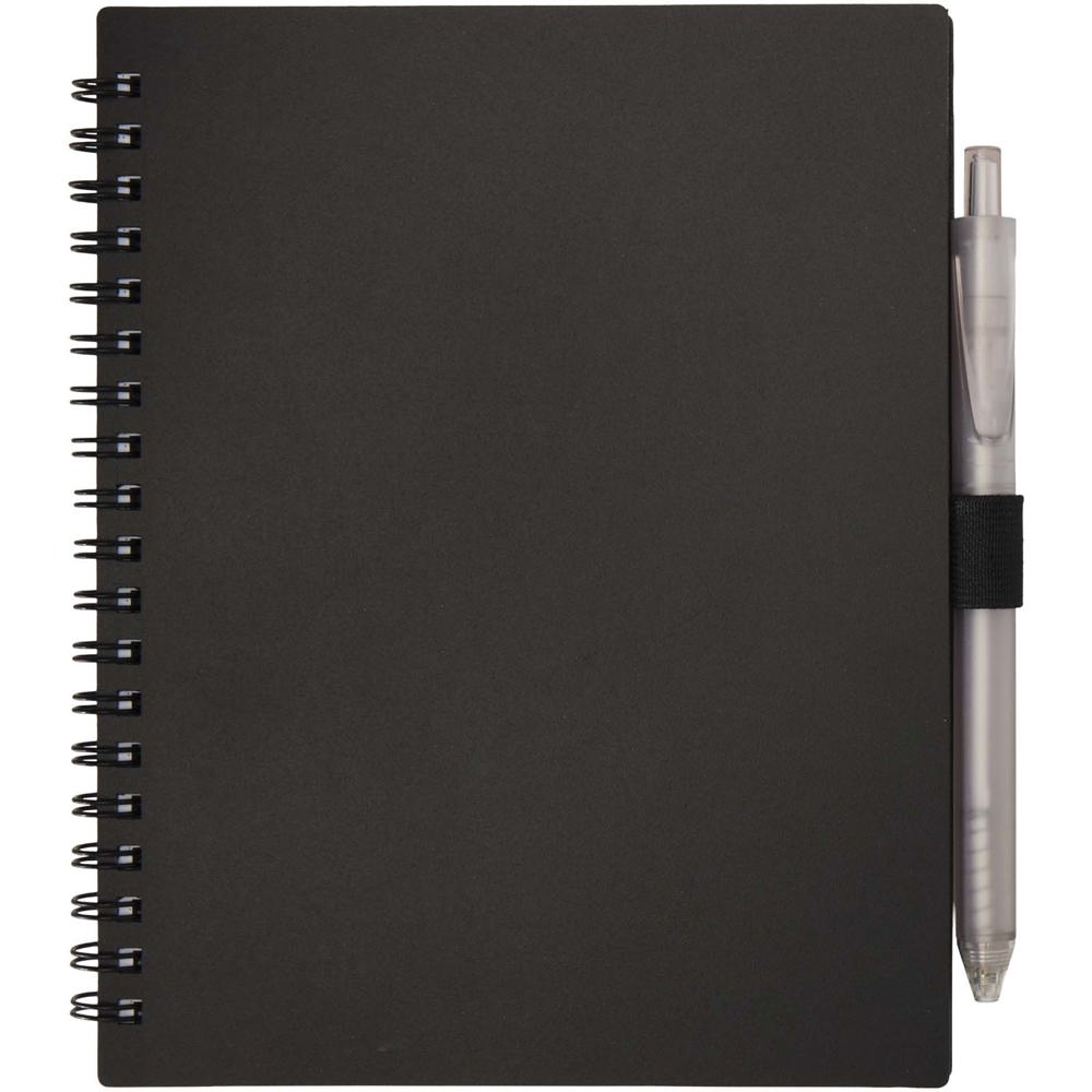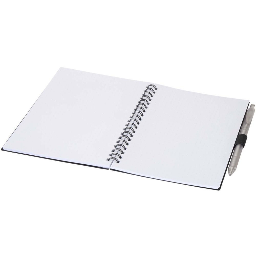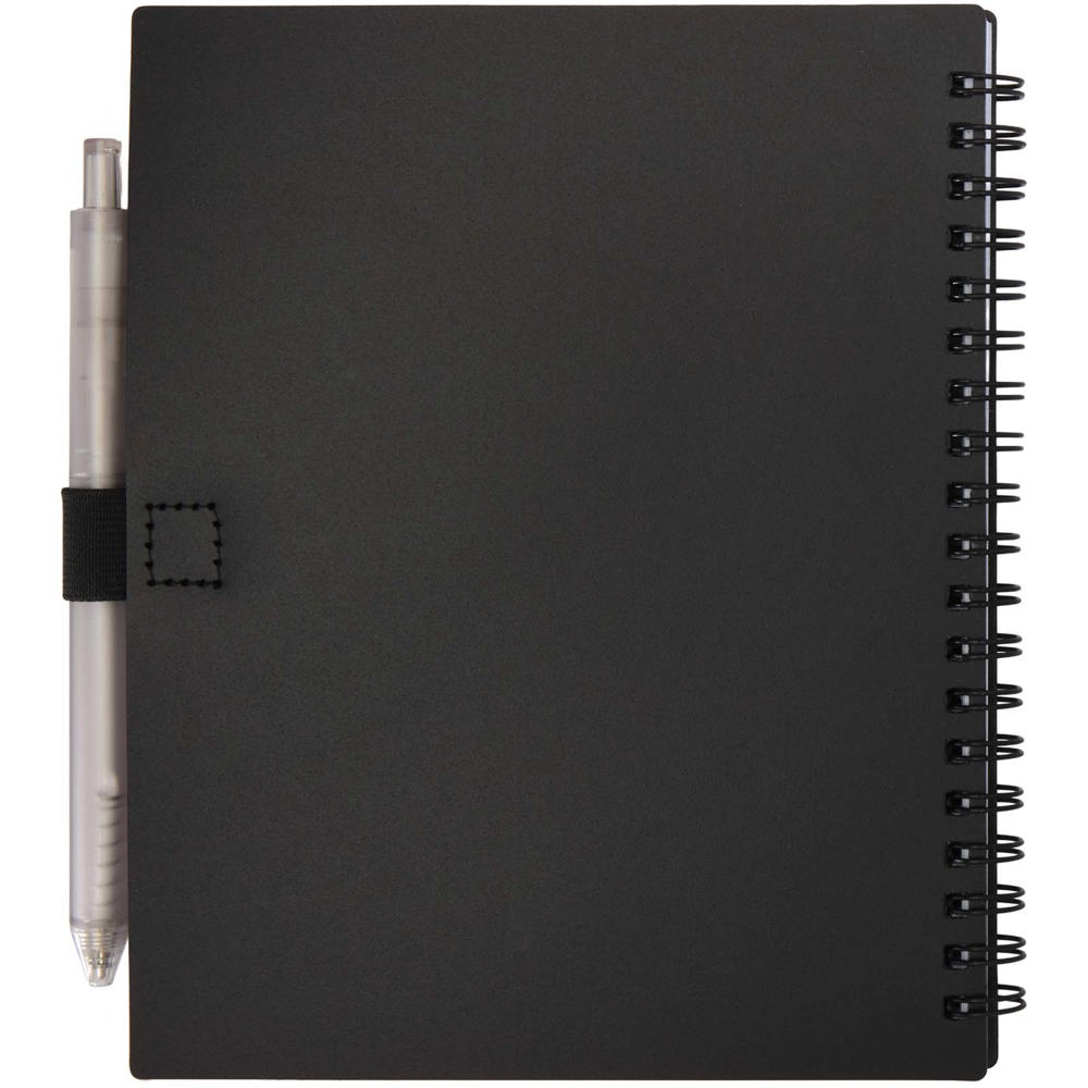 The Niove soft cover notebook is made of recycled plastic with 70 dotted sheets of 70 g/m² paper. The notebook has square corners and a pen loop. Notebook size: 140 x 178 mm. The ballpoint pen is also made of recycled plastic. Ink colour: Blue. Writing length: 1000 meters. Nib size: 1.0 mm.