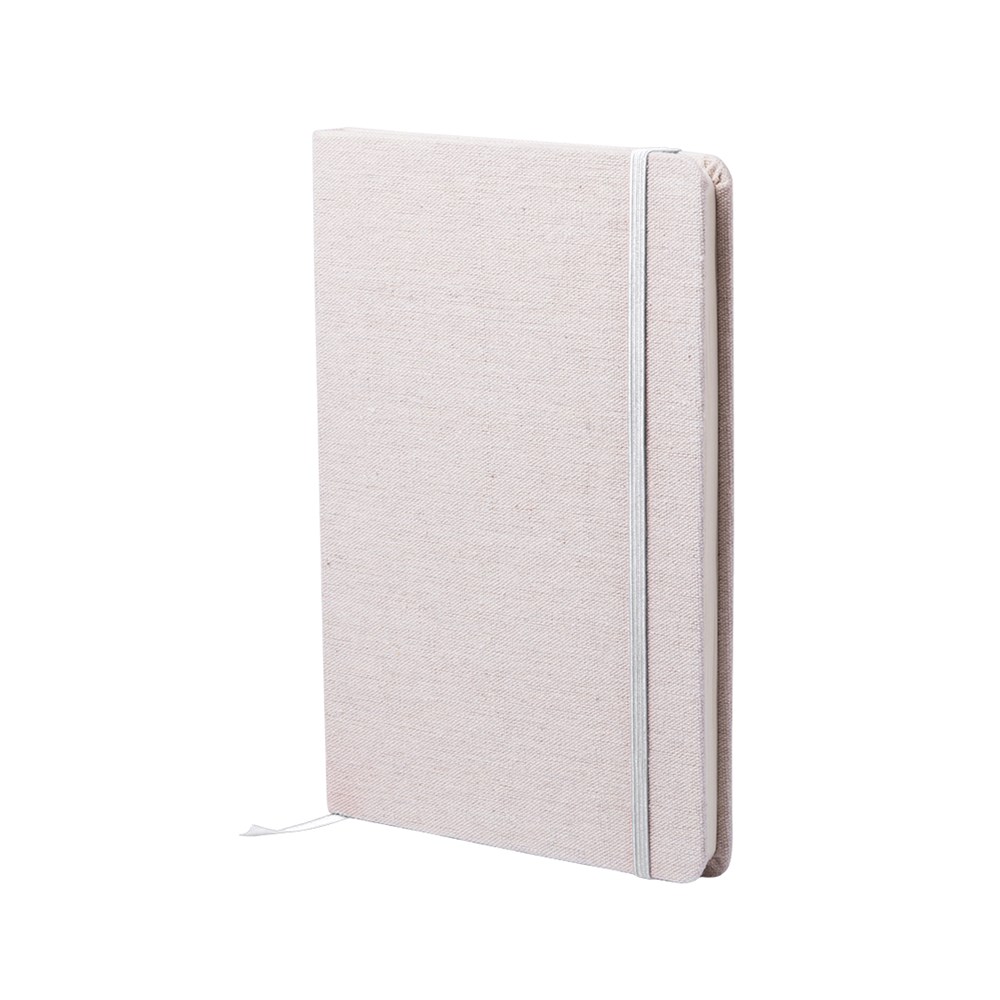 Notepad in natural materials. Covers in soft, natural color cotton. With elastic closure band and bookmark in matching, eye-catching colors. Including 80 plain sheets.