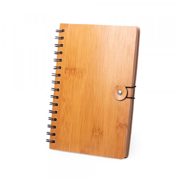 Nature line, ring notepad with hard, bamboo wood covers and an original elastic closure. 80 sheets in striped and eco-design.