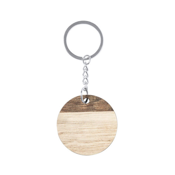 Round shape key ring, made in natural wood and with an original bicolor finish. Large branding...