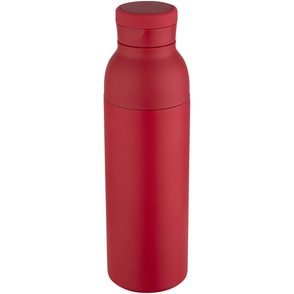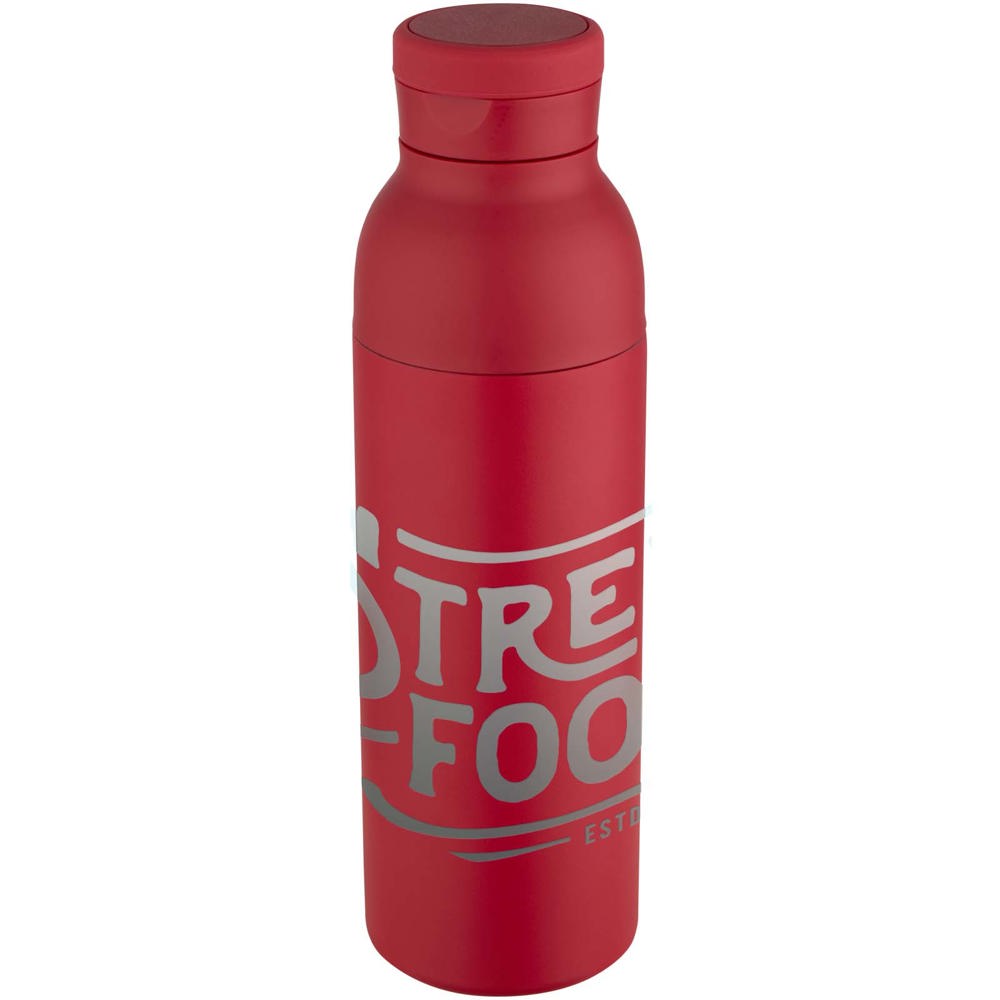 Double-walled, vacuum-insulated, RCS certified stainless steel water bottle featuring a discreet built-in silicone handle within the lid. Keeps drinks cold for 48 hours or hot for 12 hours. The two-piece construction makes cleaning easy, while the durable powder coating and copper plating ensure long-lasting performance. Presented in a recycled cardboard gift box. Volume capacity: 650 ml.