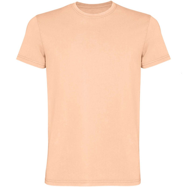 Short sleeve t-shirt for men. Acid-wash finish. 1x1 ribbed crew neck design. Tone-on-tone cover stitch with a polished finish.