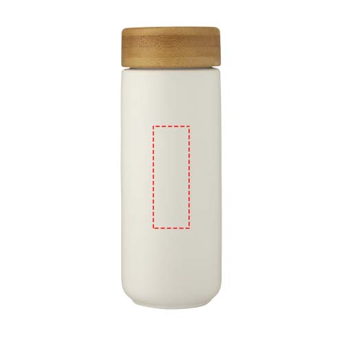Ceramic tumbler with a stylish bamboo lid. The double-wall ceramic construction helps to prevent condensation on the outside of the tumbler. The spill-resistant, screw-on lid is made from from sustainable, environmentally and socially responsible sourced bamboo. BPA-free and tested and approved under German Food Safe Legislation (LFGB). Tested and approved for phthalates content according to REACH regulations. Volume capacity is 300 ml. Hand wash recommended. Presented in a recycled cardboard gift box.