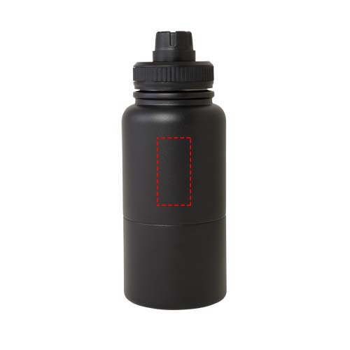 Multi-use, RCS certified stainless steel insulated bottle with a removable storage container. The top part of the bottle features a copper insulated thermos that has a volume capacity of 530 ml, and keeps drinks hot or cold for several hours. The bottom part is a double-walled container that can hold up to 340 ml. It can be used as a cup for your favourite cold beverages, or to store snacks or other small items. Presented in a recycled cardboard gift box.
