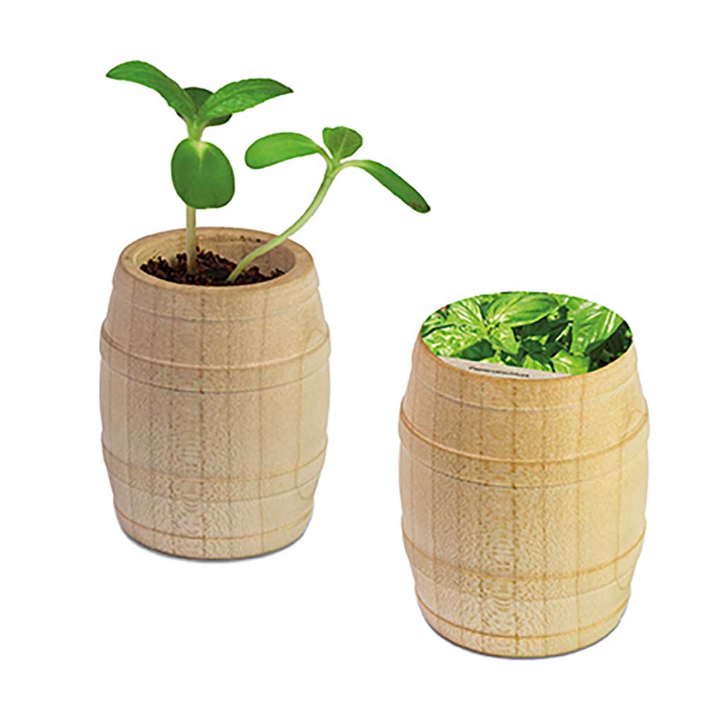 This special barrel made of light, European wood is filled with a compost pellet as soil, seeds of your choice and planting instructions. Get your promotional message moving with the individual designed paper sticker, which works as a lid. A laser engraving on the pot is optionally possible.