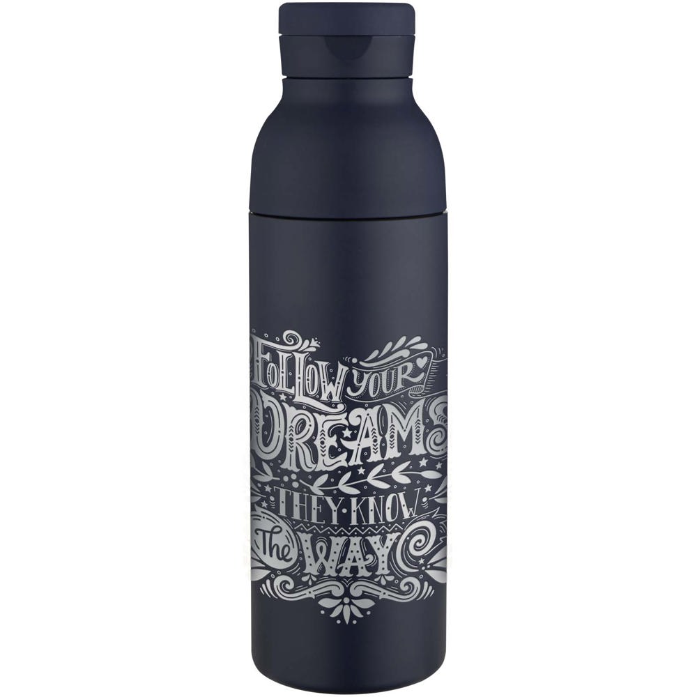 This gift set includes a 650 ml double-walled, vacuum-insulated bottle made from RCS certified stainless steel with copper plating for enhanced temperature retention. Keeps drinks cold for up to 48 hours or hot for up to 12 hours. The bottle is compatible with three interchangeable lids included in the set. Lid 1 features a discreet built-in silicone handle for easy carrying. Lid 2 is a sports lid with a flip-top drinking spout and straw. Lid 3 has a convenient stainless steel push-top opening, allowing for one-handed use. The set is presented in a recycled cardboard gift box, making it a practical and thoughtful gift.
