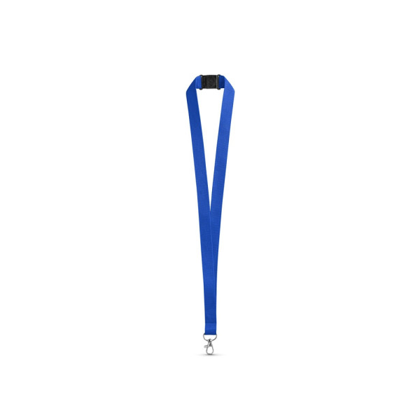 Polyester lanyard with metal carabiner and safety clasp. 20 x 470 mm