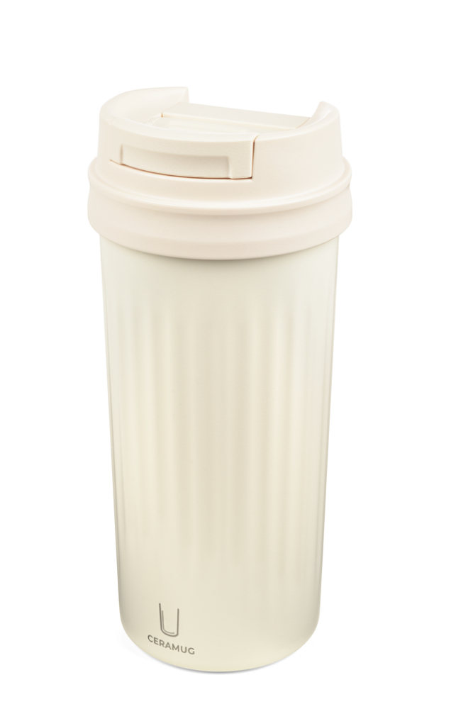 Thermal mug for coffee and other hot drinks, double-wall vacuum insulation with WEILBURGER® ceramic coating on the inside, capacity: 500 ml, leak-proof plastic lid with integrated slide closure, ribbed look, 304 stainless steel, plastic, silicone, powder-coated, matt, white