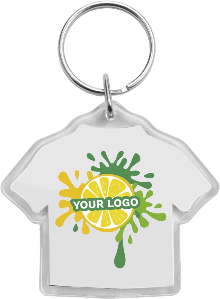 Plastic key holder on metal keyring in a t-shirt shape.