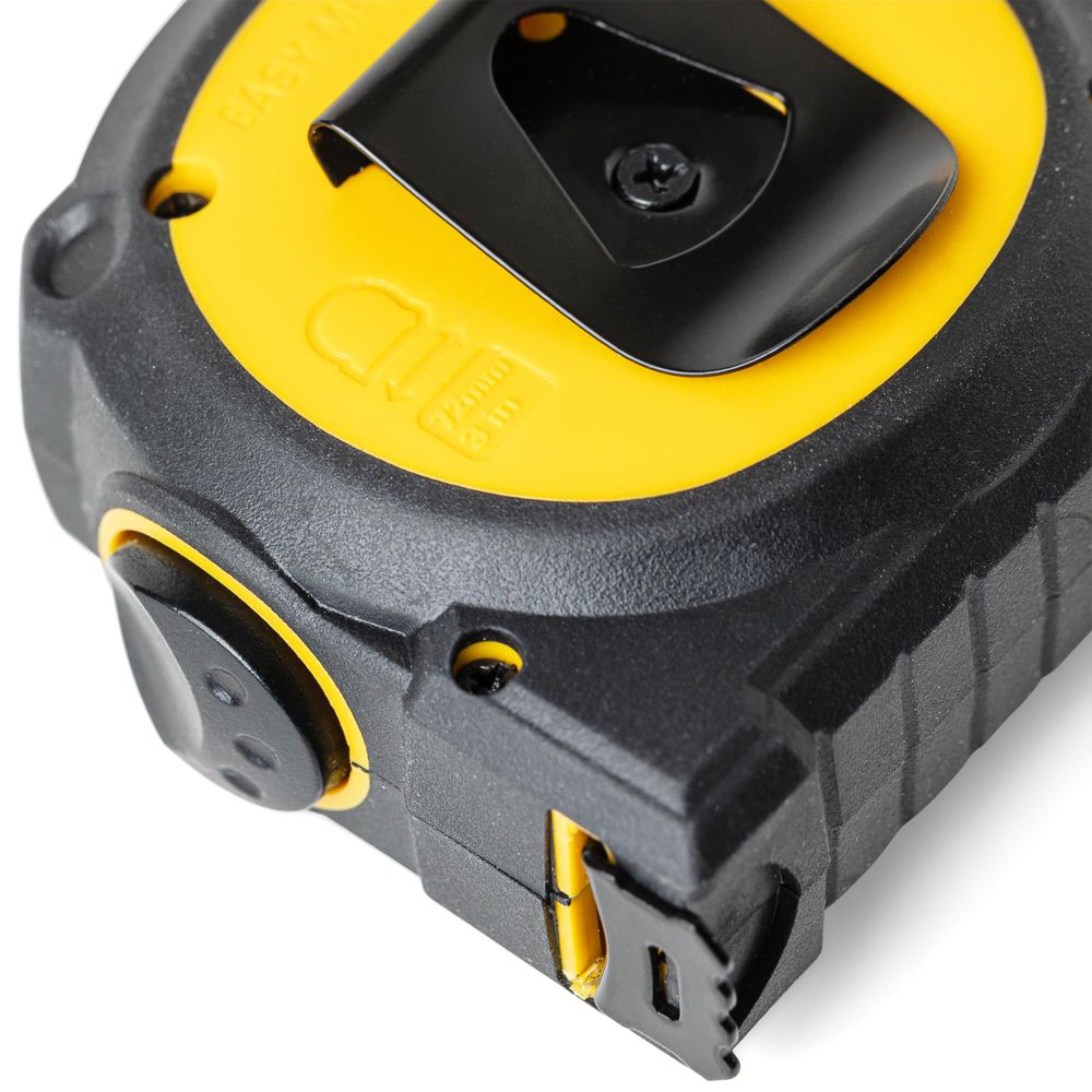 ABS and TPR tape measure with 16 mm wide metal tape and 3 meter length. Features a transparent viewing window on the topside for precise inside measurements, with the tape printed double sided. Includes lock and release function, backside clip and polyester wrist strap. Packed individually in a brown carton box with illustration.