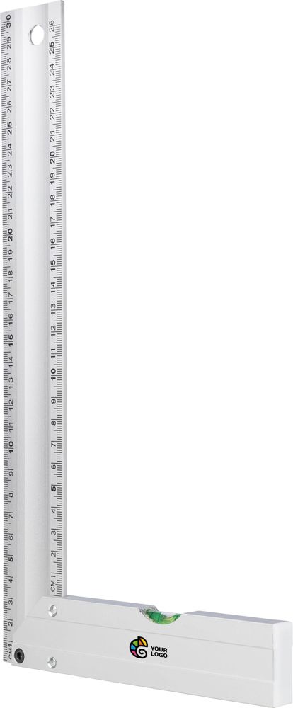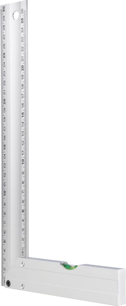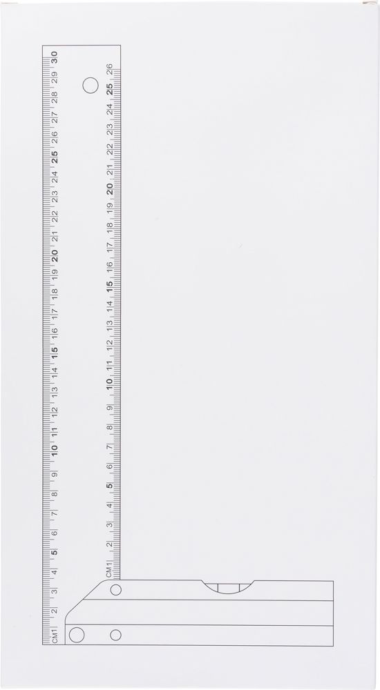 Aluminium set square with integrated spirit level. Length 30 cm with clear indication in centimeters. Practical design for precise measuring and leveling. Packed individually in a brown carton box with illustration.