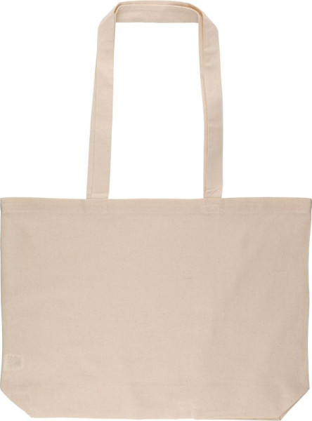 Cotton (140 gsm) shopping bag in natural color. Size 48 × 34 × 10 cm with 70 cm long handles (2.5 cm width). This product is OEKO-TEX® STANDARD 100 certified.