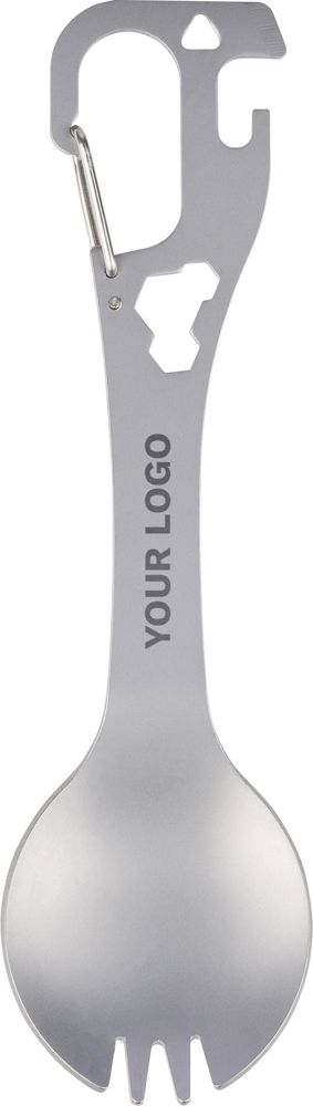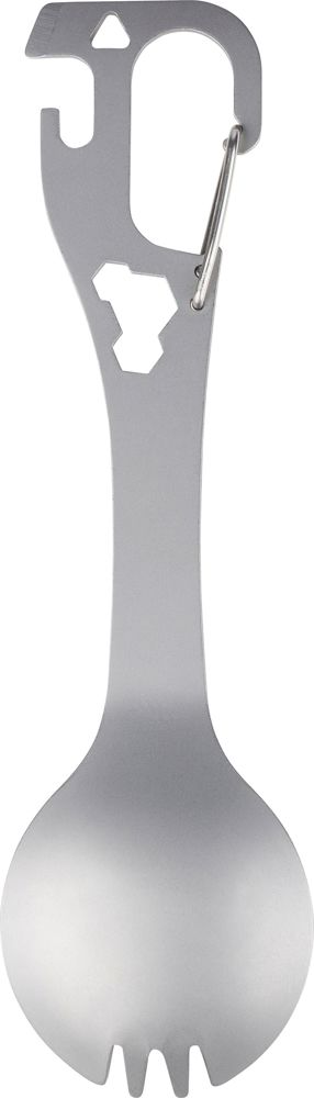 Stainless steel spork with integrated fork and spoon, flat screwdriver, bottle and can opener, and three hex keys in the body. Includes a carabiner clip. Packed per piece in a paper bag.