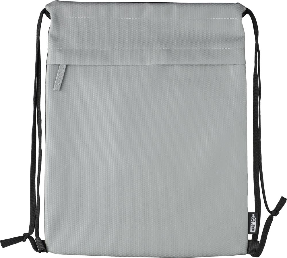 rPET (600D) polyester drawstring bag with PU coating on the front side for water repellency. Features a hidden zippered front pocket and a spacious drawstring compartment. Includes two compartments with front and inner pockets. Capacity 8 l, carrying capacity 8 kg. Includes an rPET label.